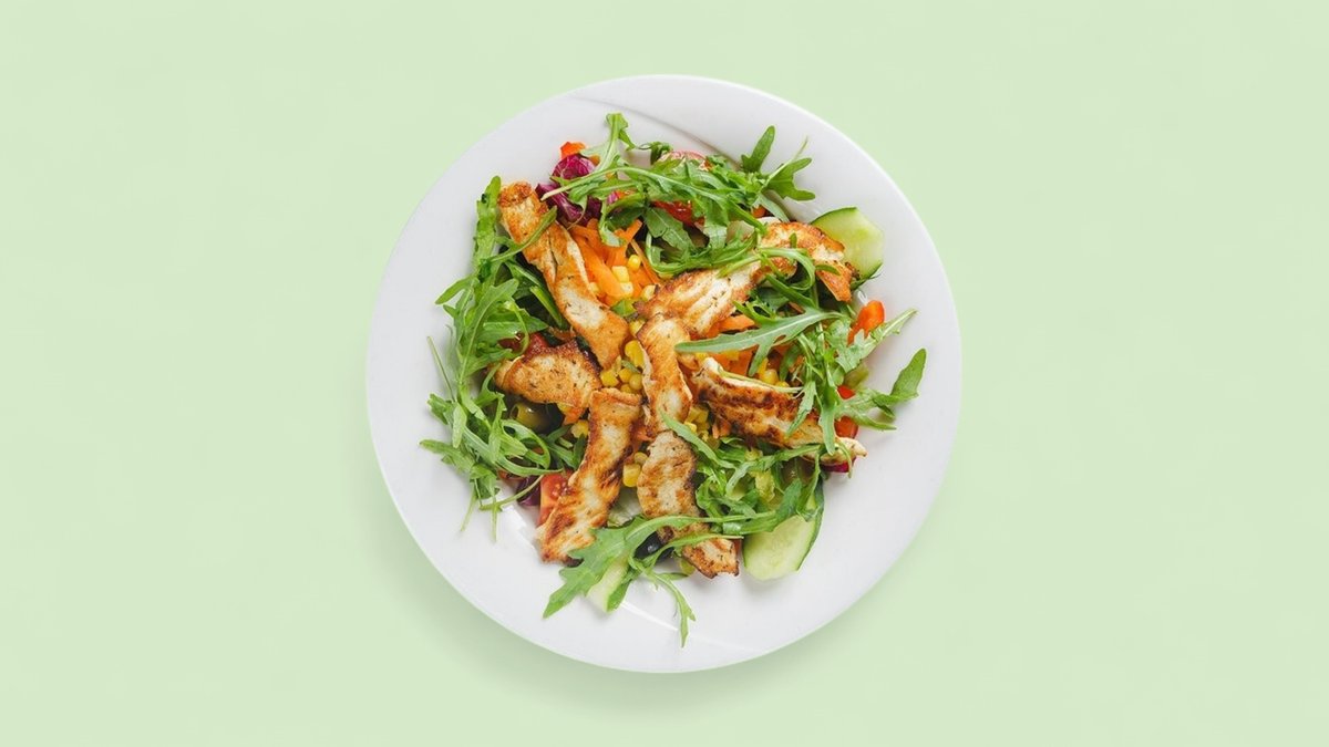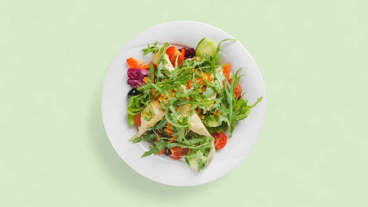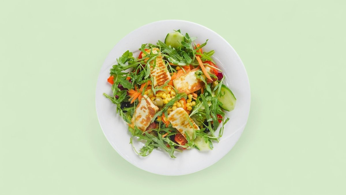 alle Salate werden mit Salat, Tomaten, Gurke, Mais, Paprika und Zwiebeln zubereitet und mit einem Dressing deiner Wahl serviert