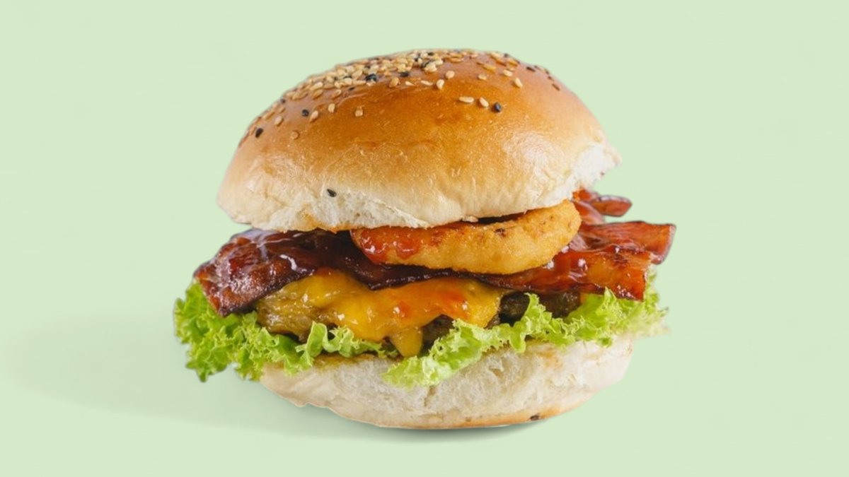 mit veganem Käse, Schmorzwiebeln, BBQ-Sauce