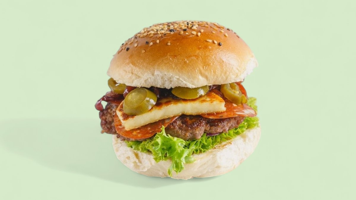 mit gegrilltem Halloumi, Chorizo-Salami, Jalapeños, karamellisierten Zwiebeln und hausgemachter Soße