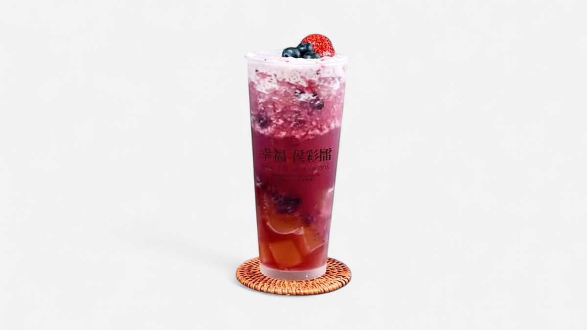 莓莓晴茶 Ein fruchtiger Slush aus Grüntee, Erdbeeren und Blaubeeren. Mit Lychee Jelly für eine saftige, besondere Textur. Erfrischend, beerig und leicht süß – voller Geschmack in jedem Schluck.