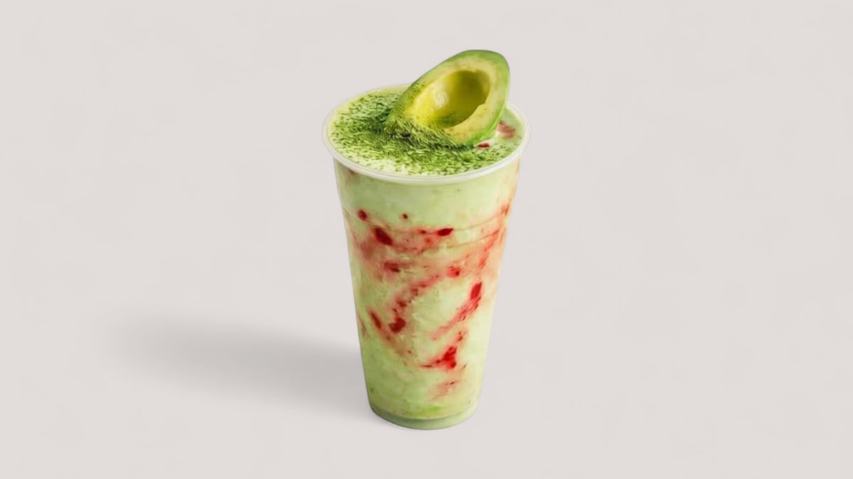 牛油果抹茶奶昔 Ein cremiger Smoothie aus Avocado, hochwertigem Matcha, Kokosmilch und frischer Milch. Fein gemixt und mit einem Hauch Erdbeersauce für eine fruchtige Note verfeinert. Mit leichtem Agar-Gelee für zusätzliche Textur – sättigend und vollmundig.
