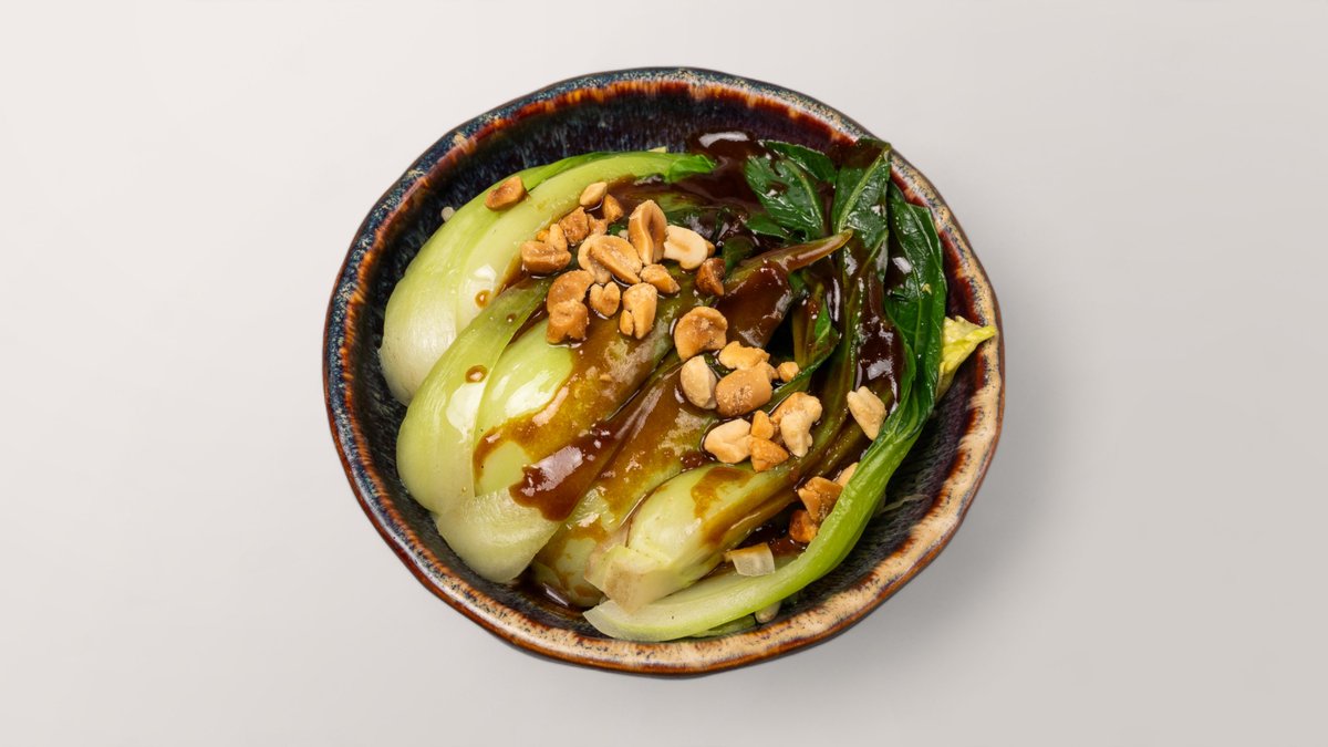 frisches Blattgemüse der Saison mit Knoblauchöl und Hoisinsoße