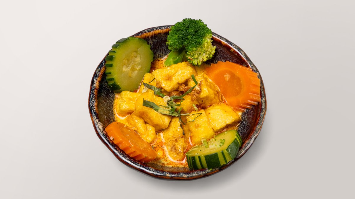 Tofu mit Currysoße, Kokosmilch, Galgant, Röstzwiebeln, Gemüse und Koriander