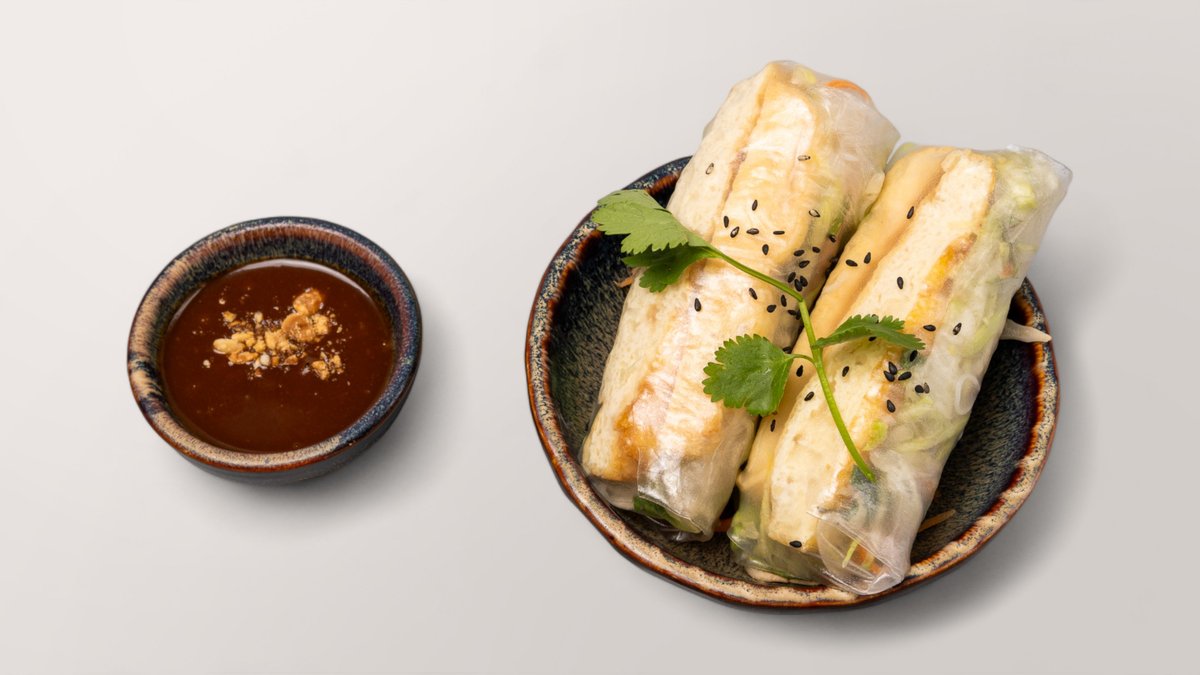 frische Saigonrolle mit Tofu, vietnamesischen Kräutern, Reisnudeln, Minze, Basilikum und Sesam, eingewickelt in Reispapier, dazu eine hausgemachte Hoisinsoße