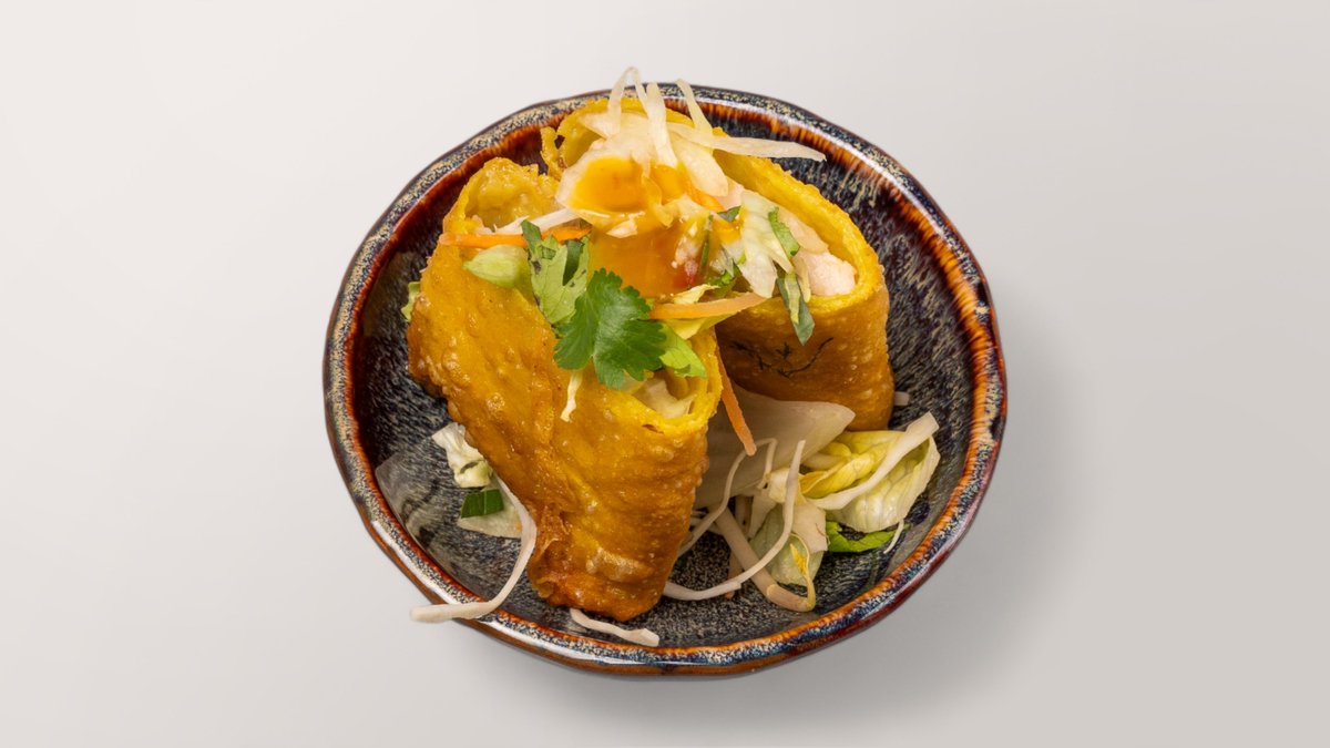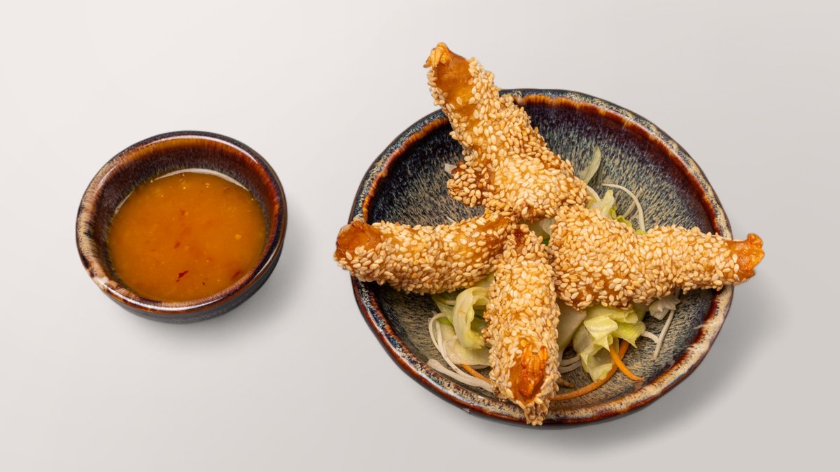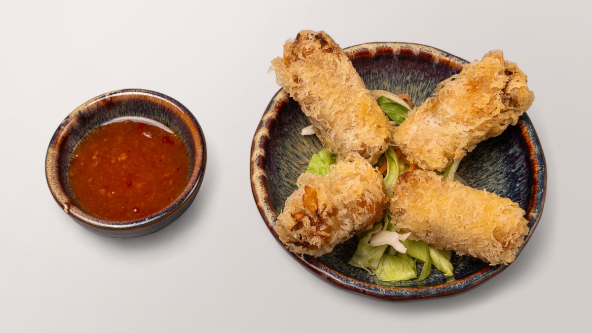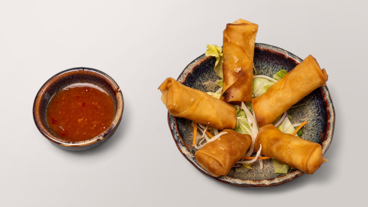 knusprige Frühlingsrollen gefüllt mit Garnelen und Gemüse, und mit einer Pflaumen-Chili Soße serviert