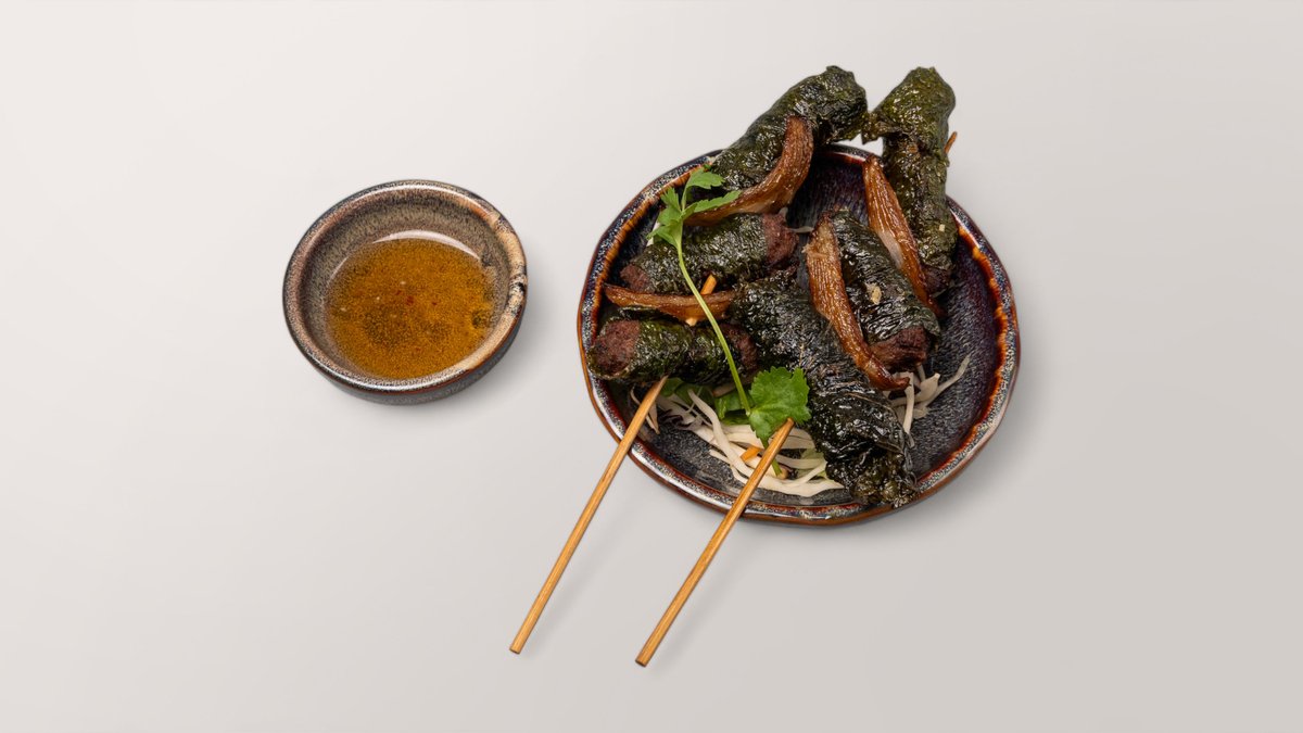 Betelblätterröllchen gefüllt mit Rindfleisch, Zitronengras und Knoblauch, dazu eine hausgemachte Limetten-Fischsoße