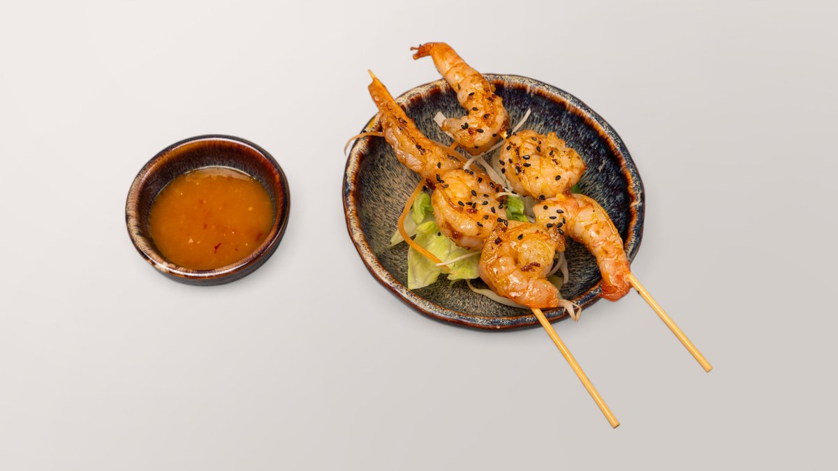 leicht scharf, gegrillte Garnelenspieße mit schwarzem Sesam, dazu ein frischer Salat und Mangosoße