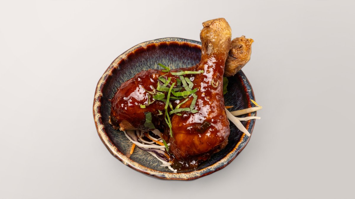 knusprig gebackene Hühnerschenkel in Honig-Schalottensoße, karamellisiert und verfeinert mit Sesamkörnern und Kräutern
