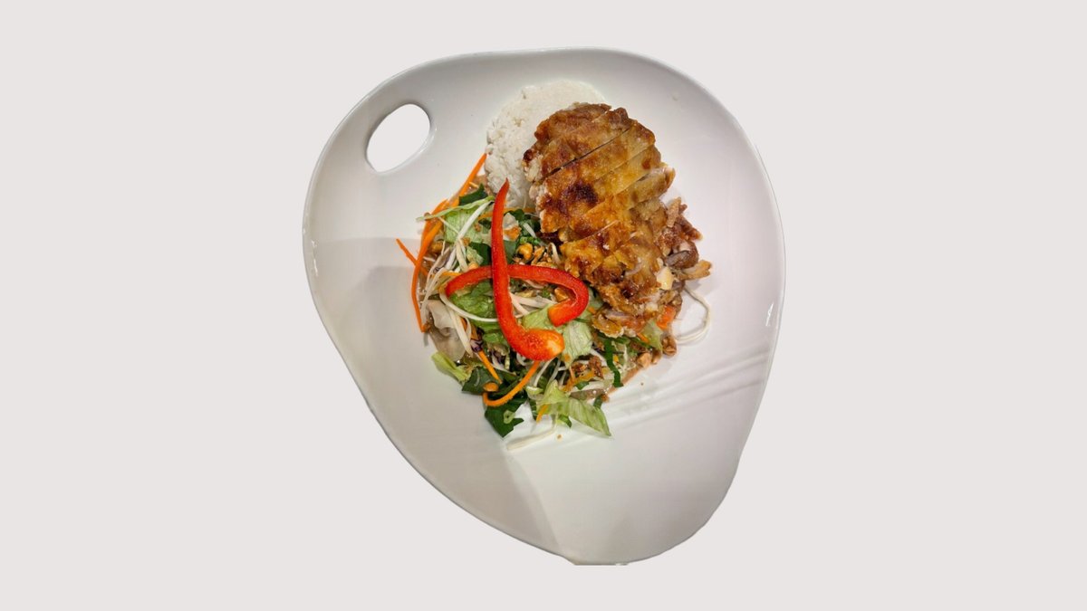 ohne Knochen, knusprig panierte Hühnerkeule auf Duftreis mit Saison Gemüse, frischen Salat Kräutern, Erdnüssen und Rostzwiebeln und mit einer hausgemachter Soße deiner Wahl