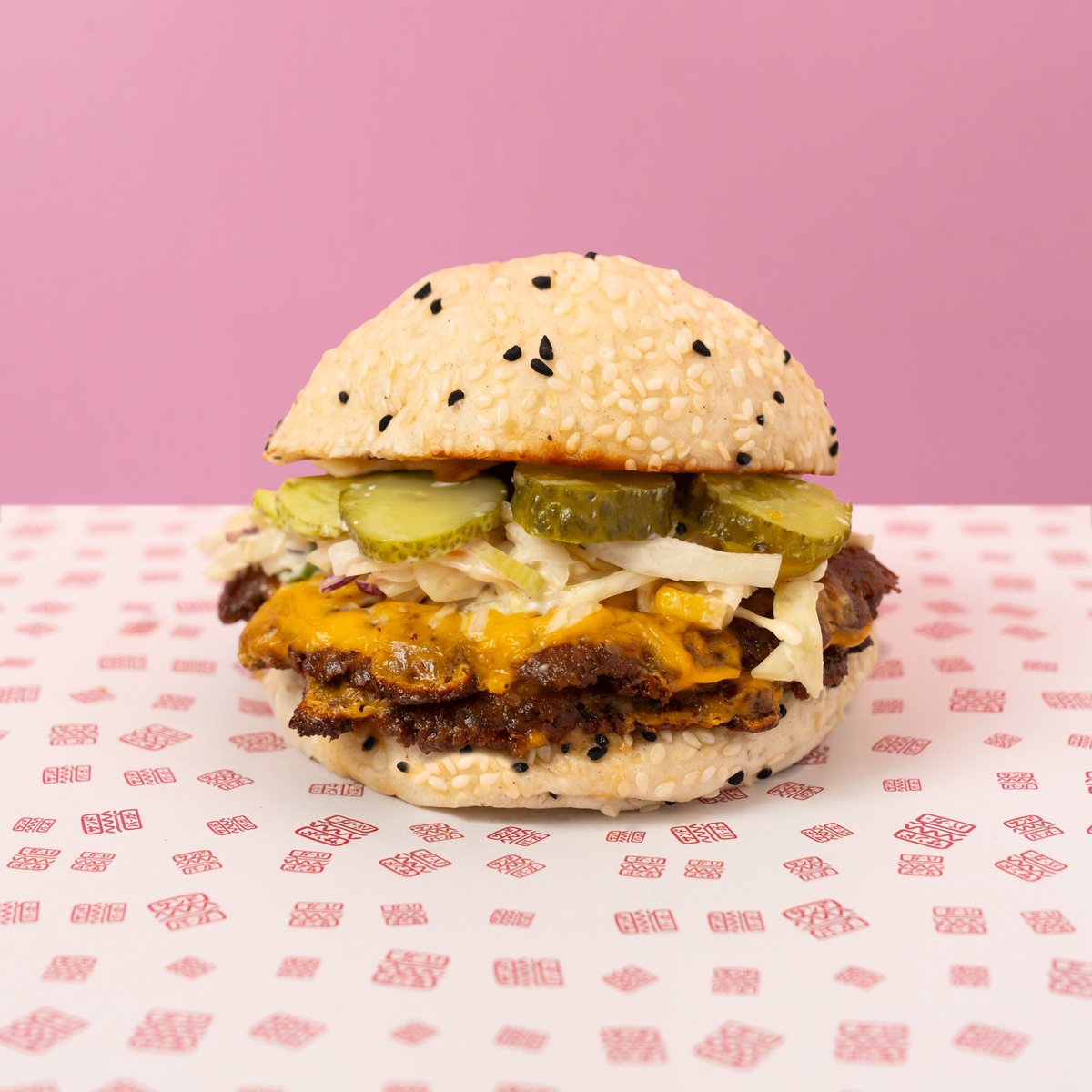 mit gebuttertem und getoastetem Sesam Bao Bun, American Cheddar, California Soße, japanischem Coleslaw, Dill Pickles und in einer Größe deiner Wahl