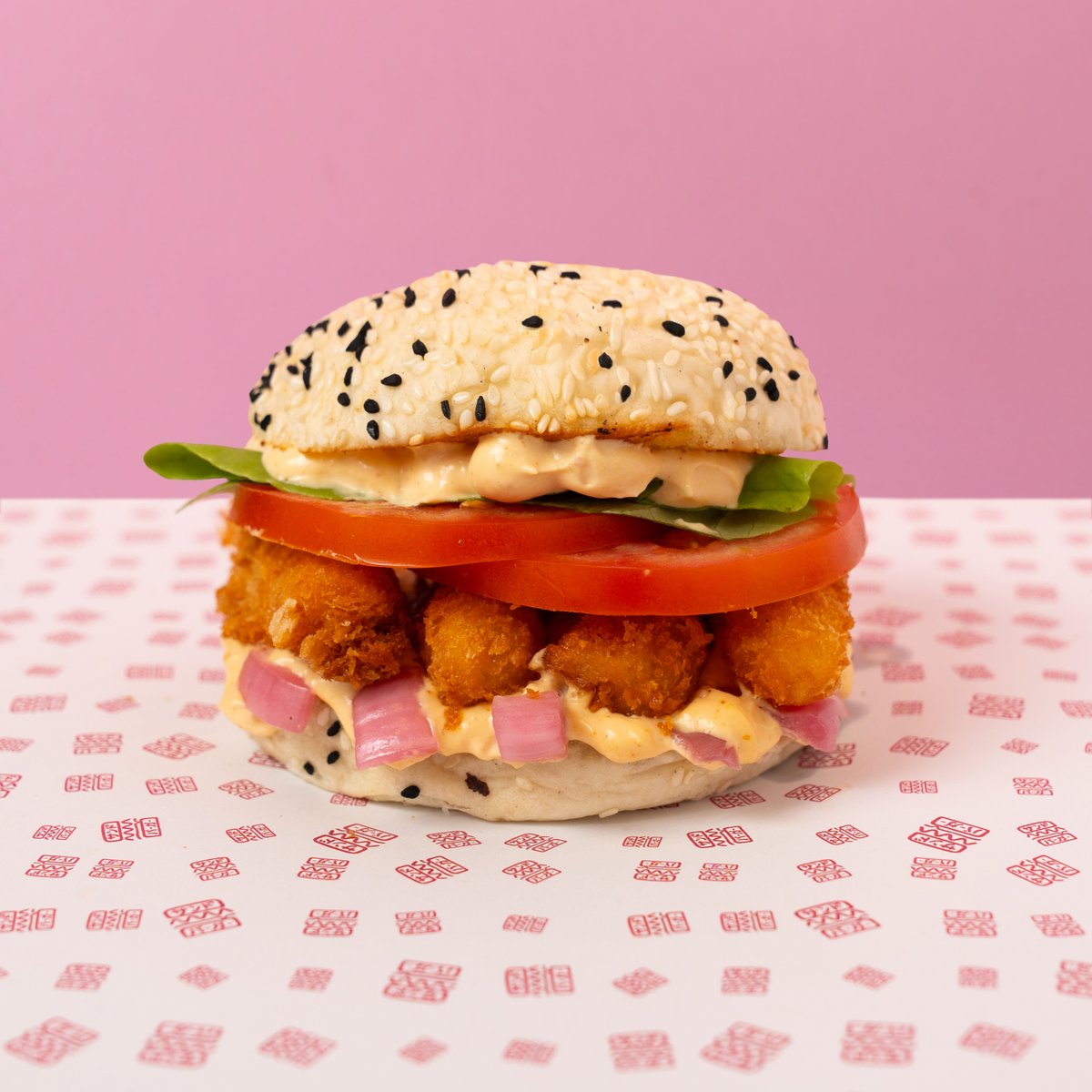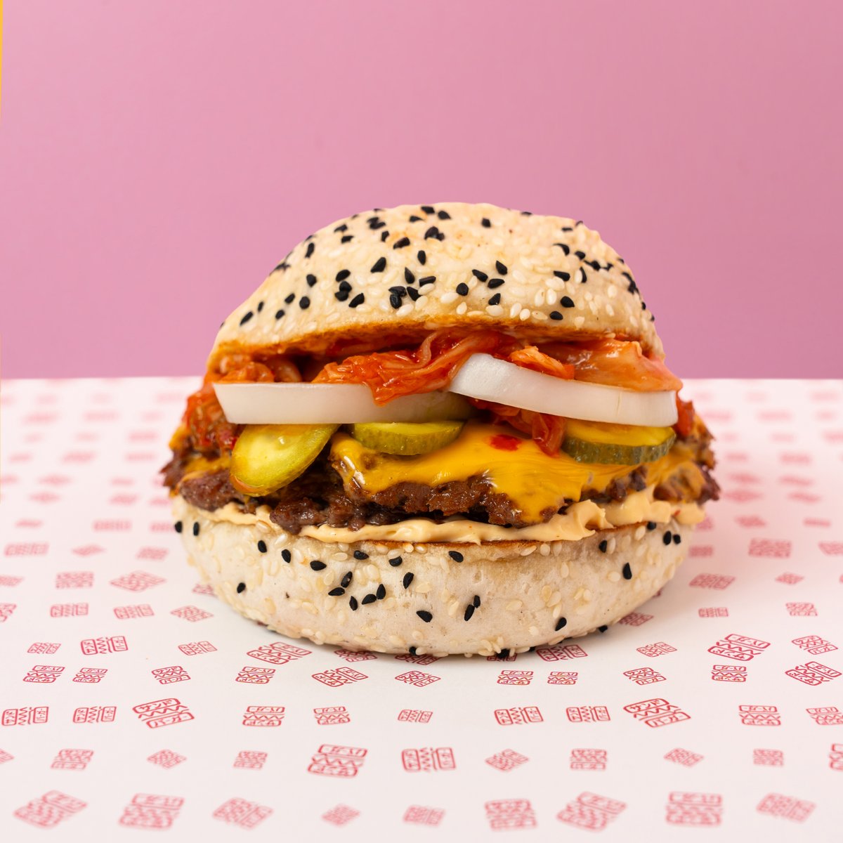mit gebuttertem und getoastetem Sesam Bao Bun, American Cheddar, japanischer Mayonnaise, eingelegtem Kimchi, Dill Pickles, weißen Zwiebeln und in einer Größe deiner Wahl