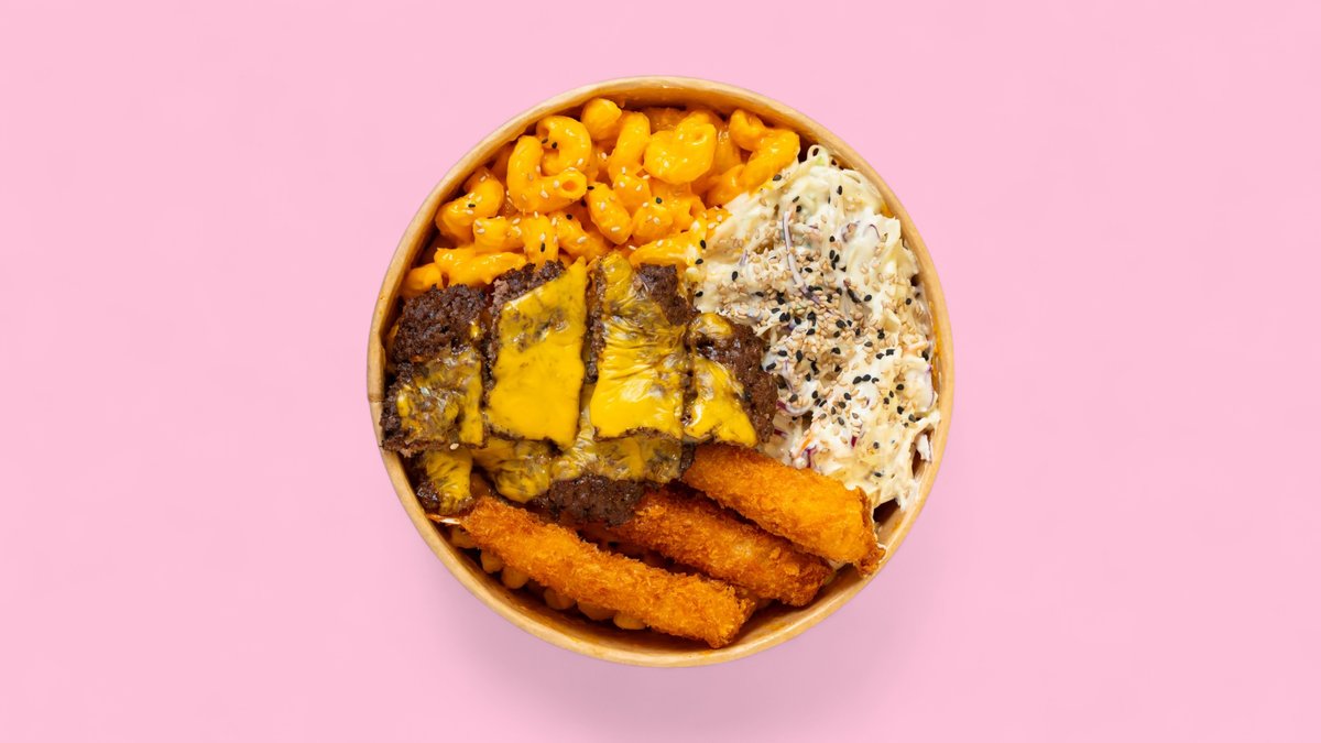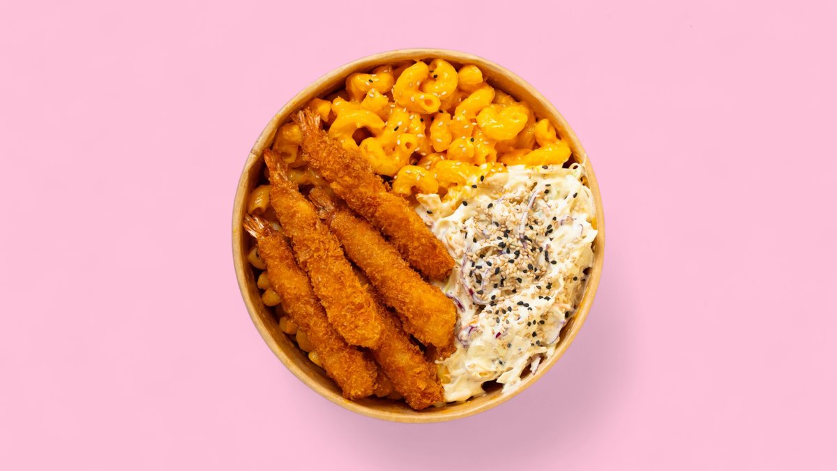 alle Bowls werden mit Macaroni ’n’ Cheese, japanischem Coleslaw, Sesam, Frühlingszwiebeln und einer Soße deiner Wahl zubereitet