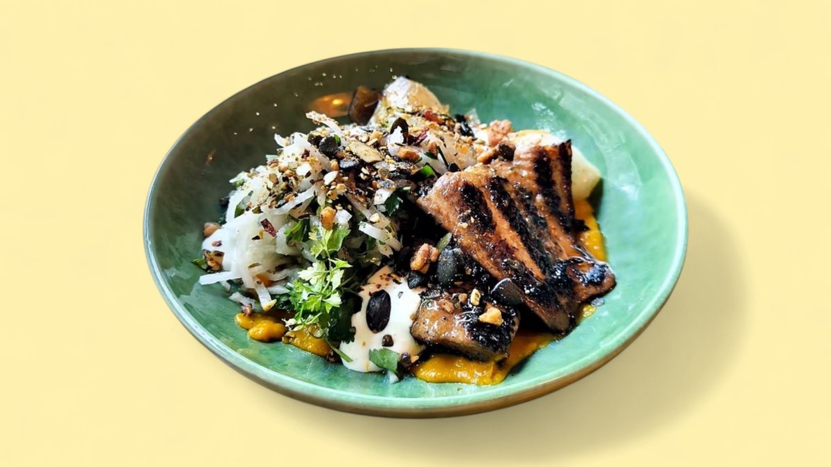 Kürbis-Püree • Miso Zwiebeln • Rettich-Kräuter-Salat • Limetten-Mayonnaise • Pak Choi • Walnuss-Kürbiskern-Knusper