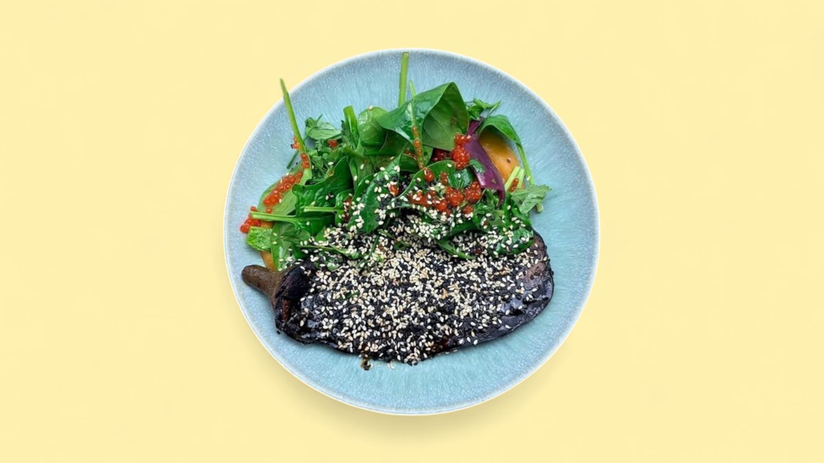 (Gebratene und marinierte Aubergine) Süßkartoffel-Sesam-Püree • Spinatsalat • Kräuter • Rote Zwiebel • Chili-Perlen • gerösteter Sesam