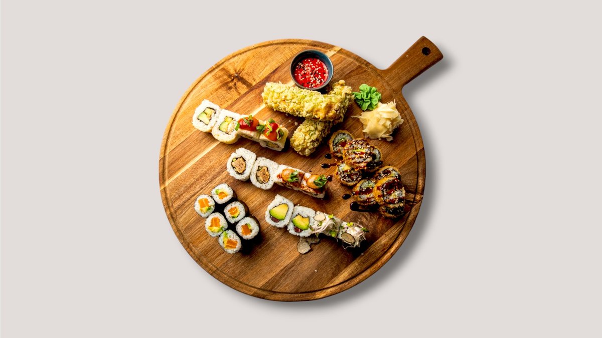 1x Edamame, 1x Sommernächte, 1x Kazuki Sticks (G), 1x Little Island 6x Maki - Tempura Rettich (G), 6x Maki - Avocado & Plant Lachs 6x Maki - Avocado & Mango, 1x 2 Stk Enoki Nigiri, 1x 2 Stk Avocado Nigiri 8x Happy Tiger Inside-out (G), 8x Raijins Thunder Taste Inside-out 4x Crispy Mini Roll mit Paprika & Plant Frischkäse (G, M) 4x Crispy Mini Roll mit eingelegtem Kürbis (G) 8x Tempura Pyramide (G), 1x 2 Stk Inari Special