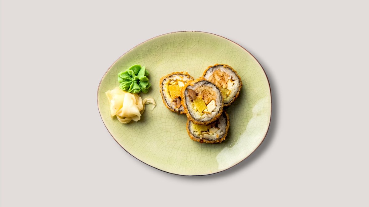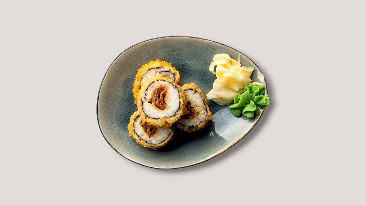Fritierte Sushi Rolle mit Aubergine, Tofu, Rettich, Plant Chicken, Unagi Sauce und Sesam