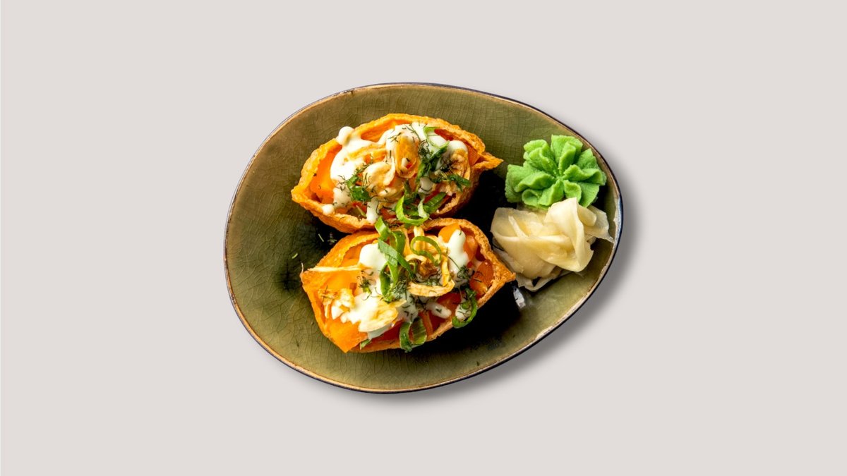 Tofutasche mit Sushi Reis, Plant Lachs Tatar, Dill, Frühlingszwiebeln, Röstzwiebeln und Wasabi Mayo