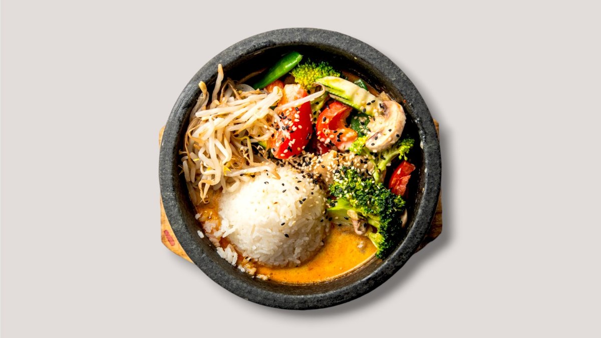 Rotes Edel Curry mit Plant Chicken, Zitronengras und Kokosmilch, frisches Saisongemüse, Röstzwiebel und Kräuter auf Duftreis