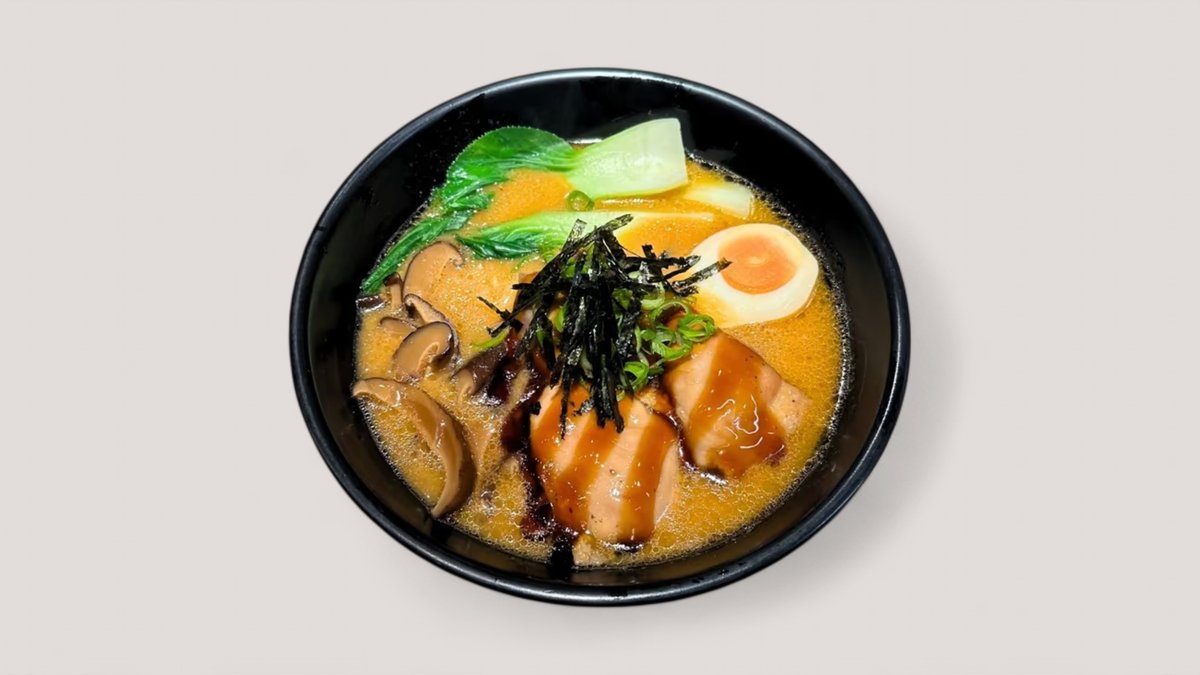 mit veganer Brühe, Weizennudeln, Pak Choi, Lauchzwiebeln, mariniertem Ei, Nori, Chicken Teriyaki und Shiitake Pilzen