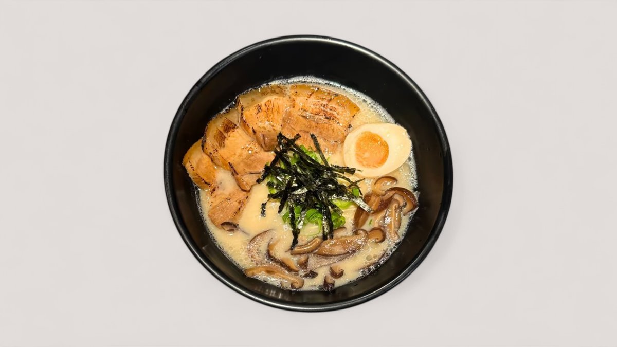 mit Paitan Brühe, Weizennudeln, Shiitake Pilzen, mariniertem Ei, Lauchzwiebeln, Nori und Schweinebauch