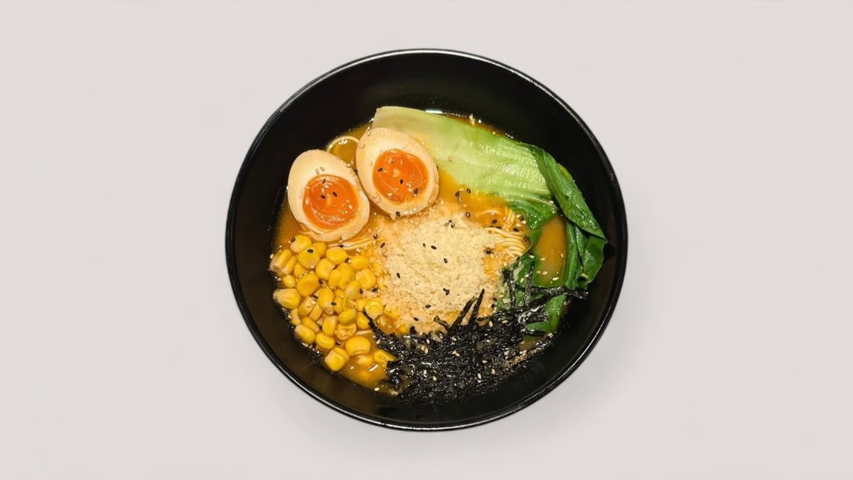 Miso Brühe, Weizennudeln, Pak Choi, Trüffel Öl, Reibekäse, Mais, Nori, Lauchzwiebeln
