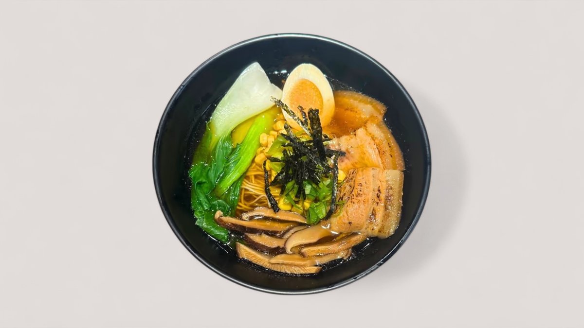 mit Shoyu Brühe, Weizennudeln, Pak Choi, Mais, Nori, mariniertem Ei, Lauchzwiebeln, Shiitake Pilzen und Schweinebauch oder Tofu