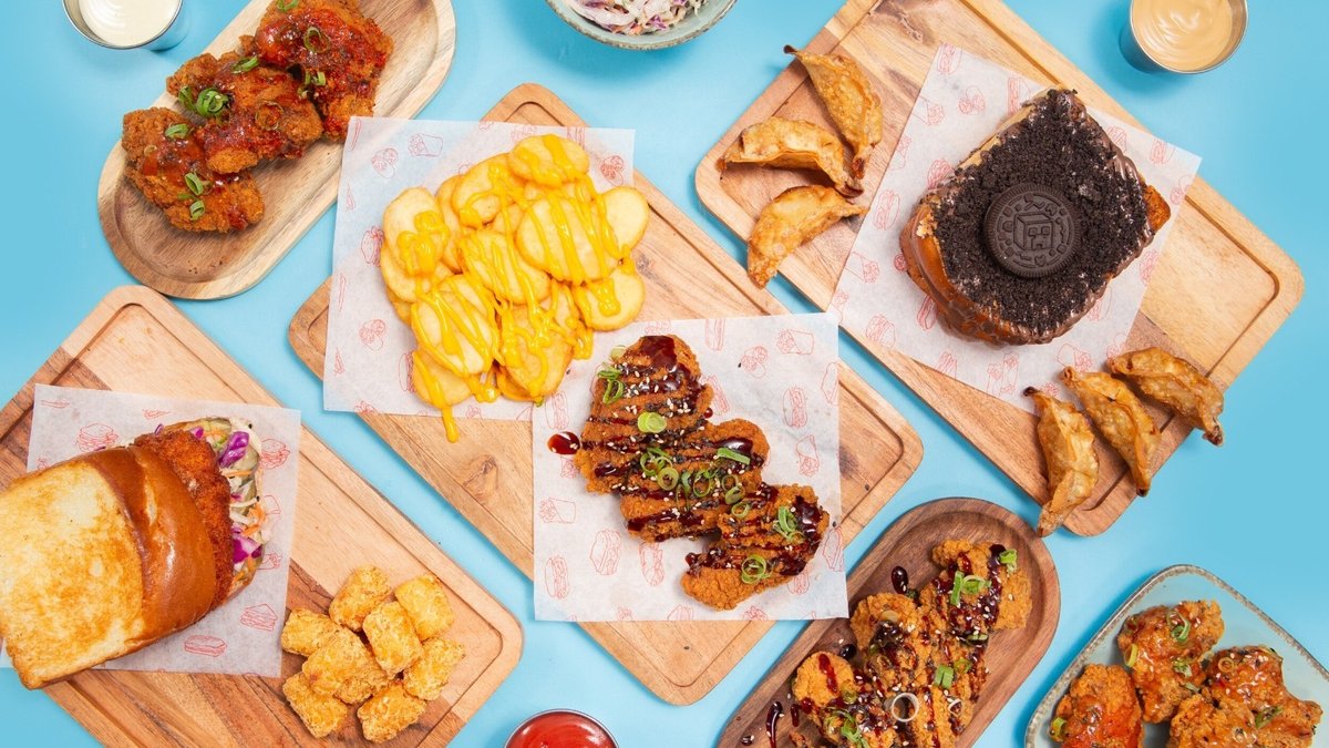 mit Fried Chicken, Kartoffelchippusu, Sesam, Frühlingszwiebeln, Käsesoße und einer Soße deiner Wahl