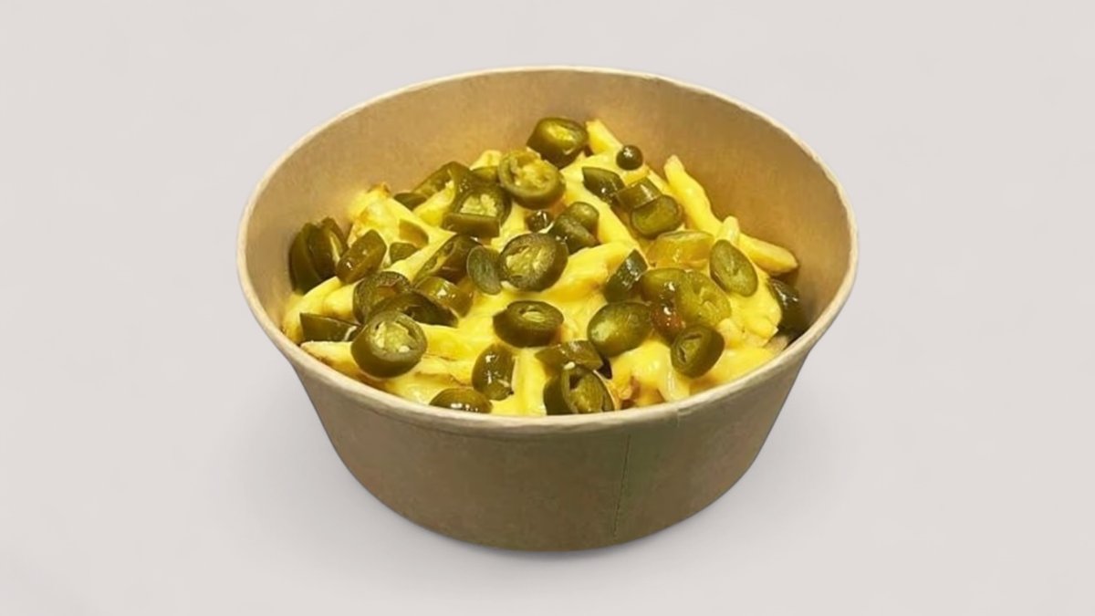 mit French Fries, Käsesoße, Jalapeños, hausgemachter Soße, zerschlagem Rindfleisch-Patty, Käse und Röstzwiebeln