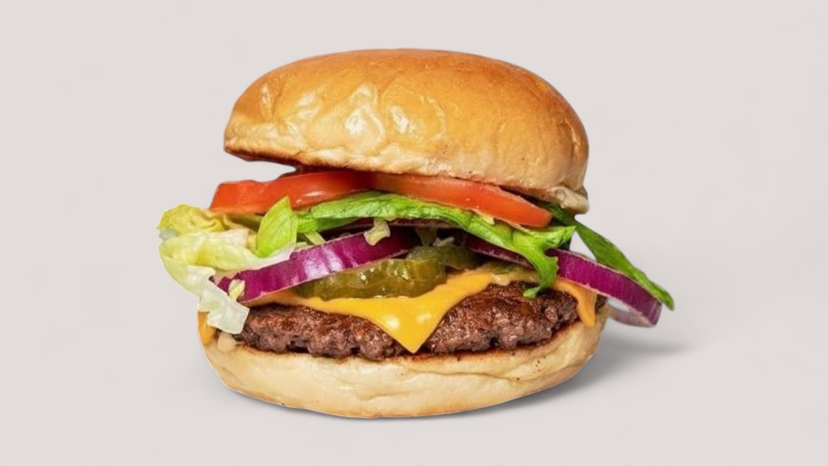 mit Rindfleisch-Patty, Käse, hausgemachter Soße, Barbecuesoße, roten Zwiebeln und Tomaten