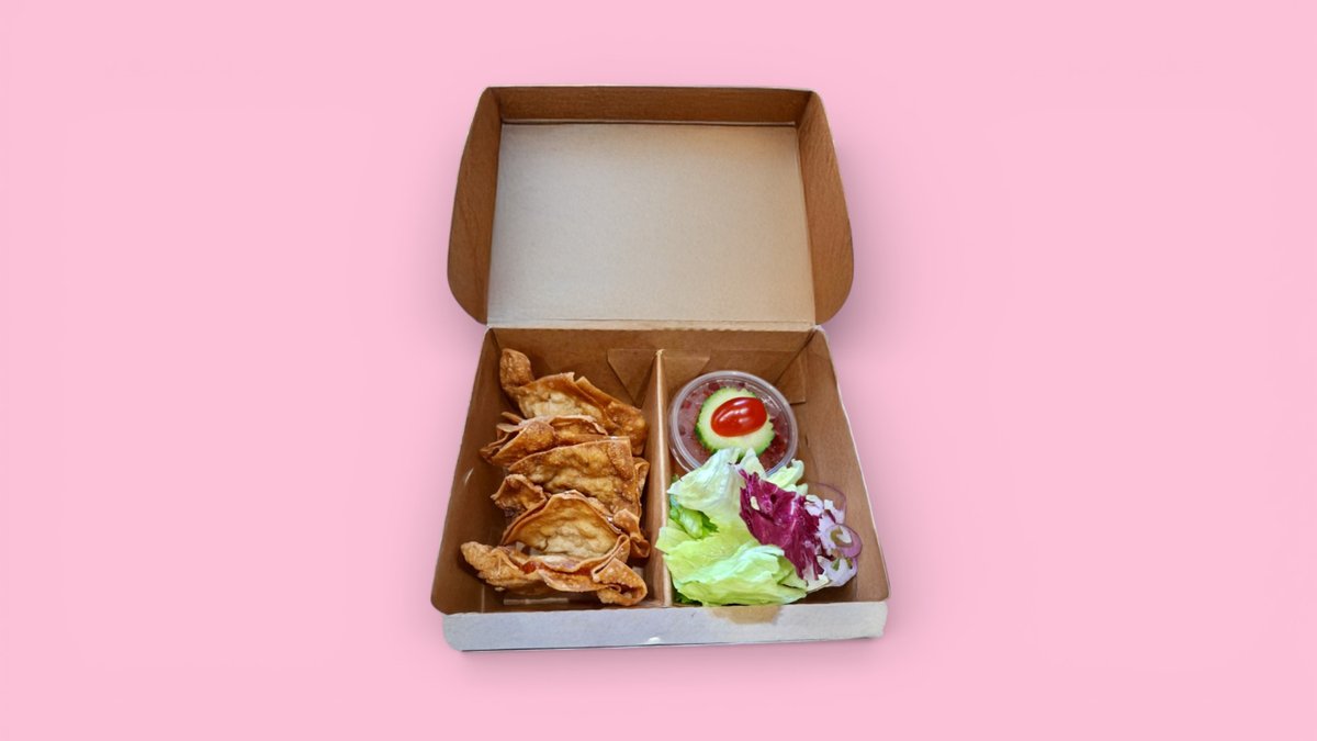 Knusprig frittierte, flache Dumplings mit Hähnchenfüllung nach Thai-Streetfood-Art. Dazu frischer Salat und eine süß-scharfe Sauce.