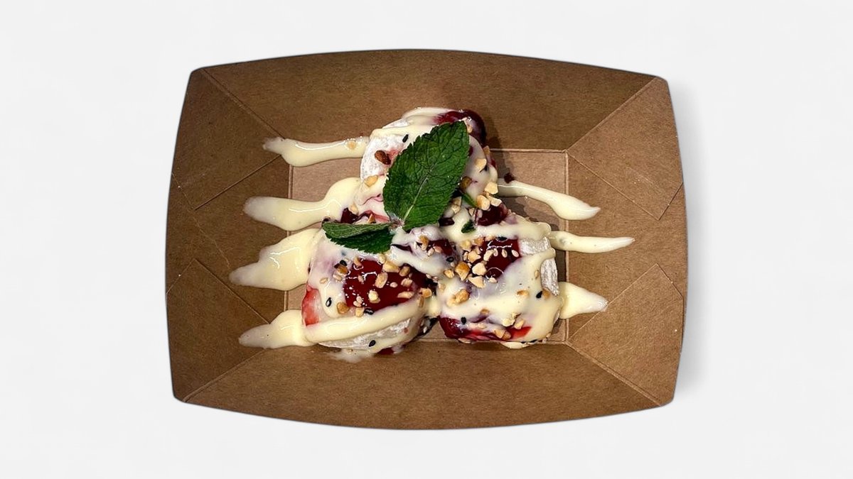 Warm gedämpftes Bao Bun Brötchen bedeckt von heiß gekochter roter Grütze. Garniert mit einer Vanille Soße, Zimt, gemahlenen Haselnüssen und Sesam.