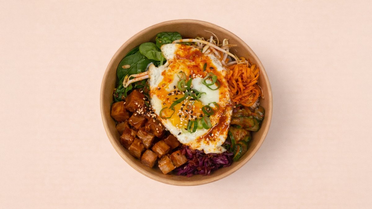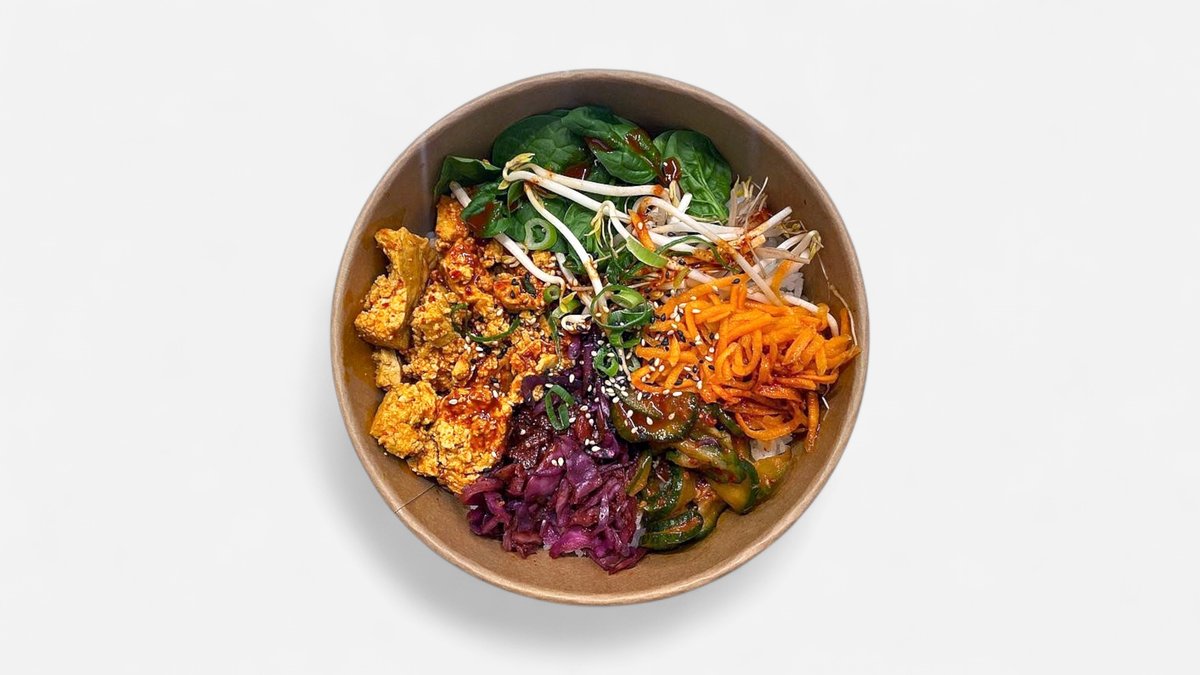 Ein bunter Mix aus Salat, pikant mariniertem Tofu, Karotten, Tomaten Salsa, Gurken-Kimchee, Sojasprossen, Rotkohl-Kimchee, Frühlingszwiebeln, Sesam-Sojasoße und Spiegelei (bestimmen Sie selbst den Schärfegrad mit einer mitgelieferten, süßlich-scharfen Chilisoße)