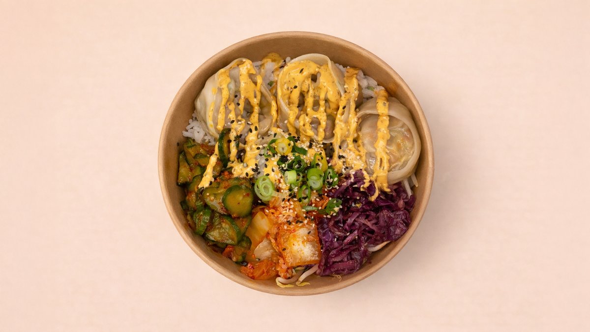 Koreanischer Reis mit 4 gedämpften Dumplings gefüllt mit Bulgogi Rindfleisch, Sojasprossen, Sojasauce, Napa-Kimchee, Gurken-Kimchee, Rotkohl-Kimchee, Chipotle-Mayonnaise, Frühlingszwiebeln und Sesam