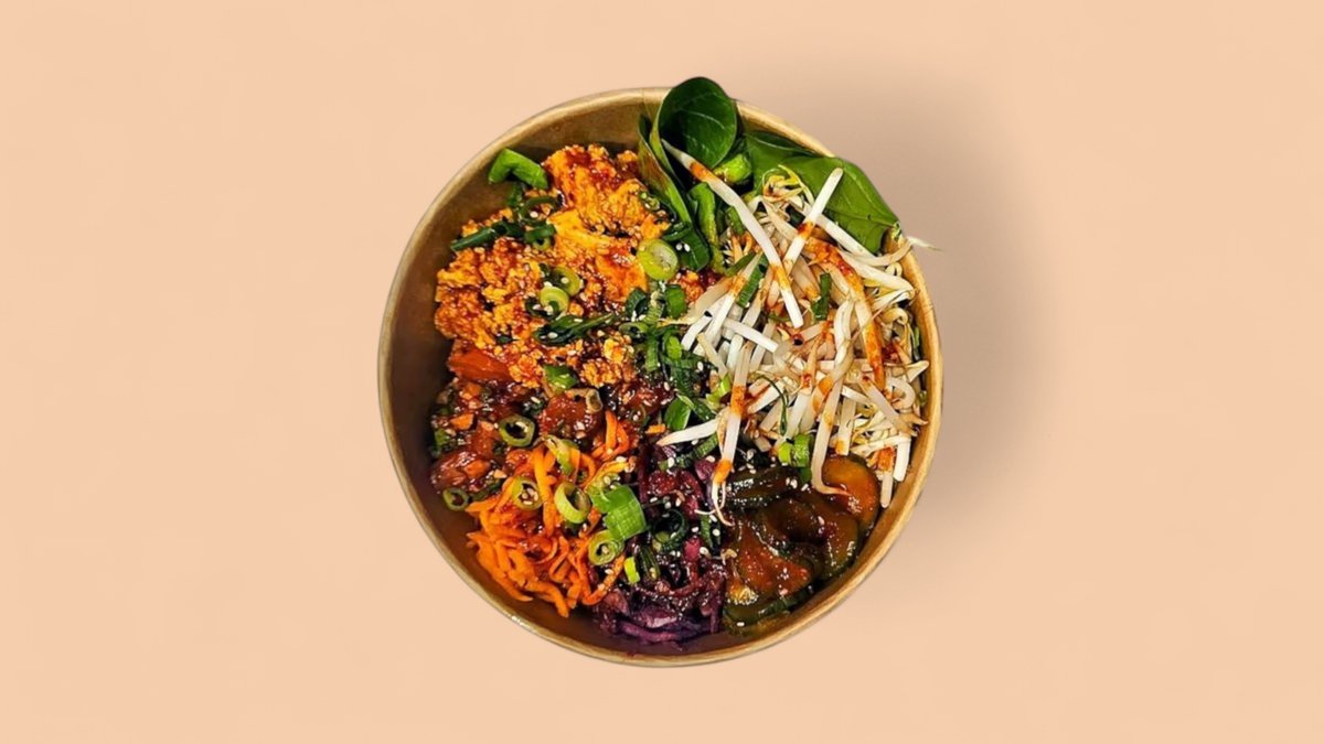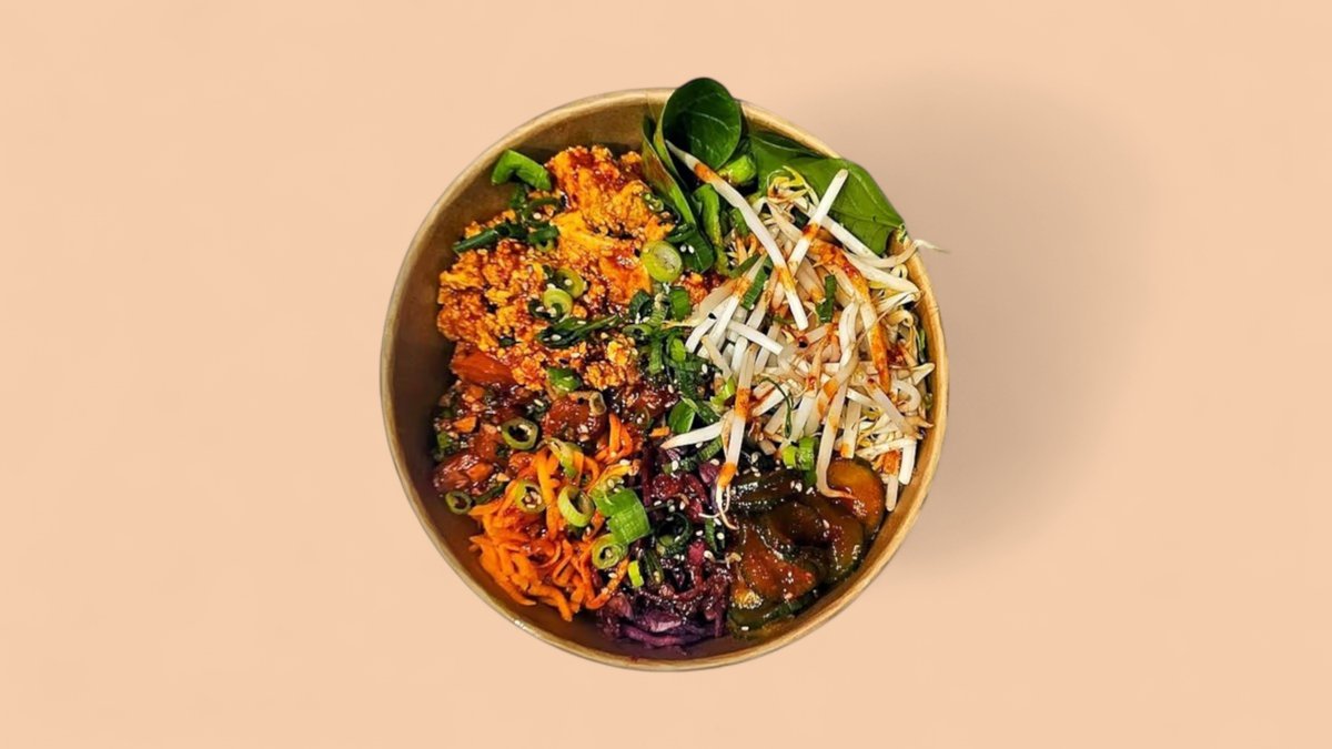 Ein bunter Mix aus Salat, Vegan Spam, Karotten, Tomaten Salsa, Gurken-Kimchee, Sojasprossen, Rotkohl-Kimchee, Frühlingszwiebeln, Sesam-Sojasoße und Spiegelei (bestimmen Sie selbst den Schärfegrad mit einer mitgelieferten, süßlich-scharfen Chilisoße)