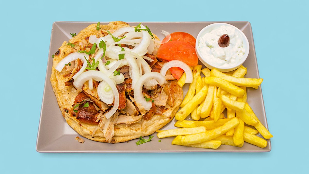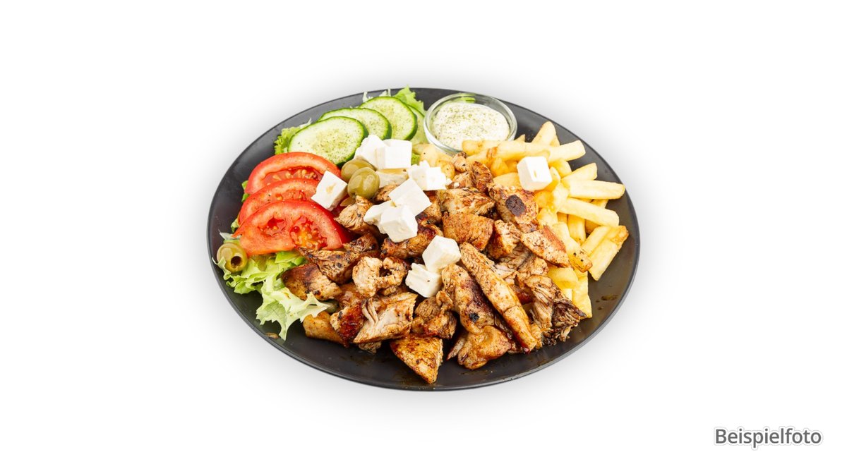 mit Pommes frites, Tomaten, Zwiebeln, Salat, Tsatsiki und einer Zutat deiner Wahl