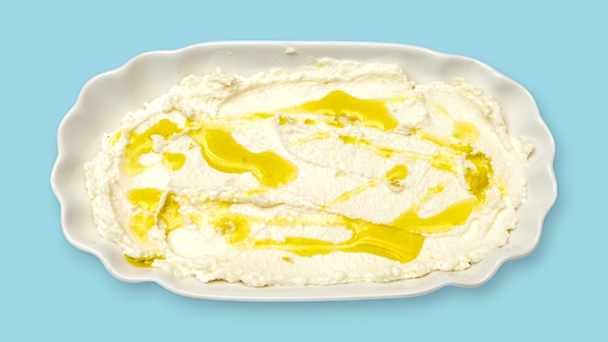 pürierter Fetakäse mit geschälter Spitzpaprika, Joghurt, Knoblauchzehe und Olivenöl
