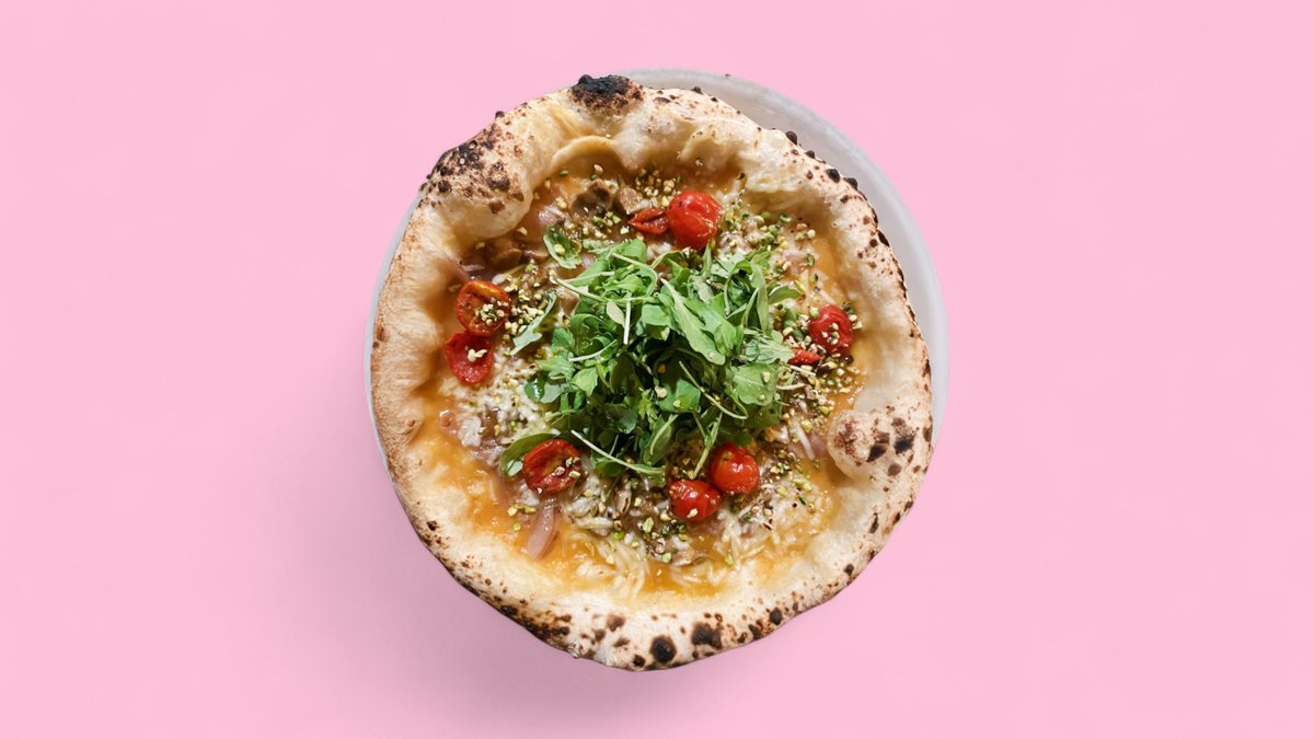 Gelbe Tomatensauce, Knoblauch, vegane Mozzarella, Steinpilze*, Tropea-Zwiebel, confierte Kirschtomaten, Rucola, Pistazien