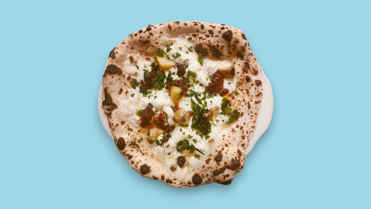 Fiordilatte, Provola, ’Nduja-Salami, Kartoffeln, schwarzer Pfeffer, frittes Basilikum