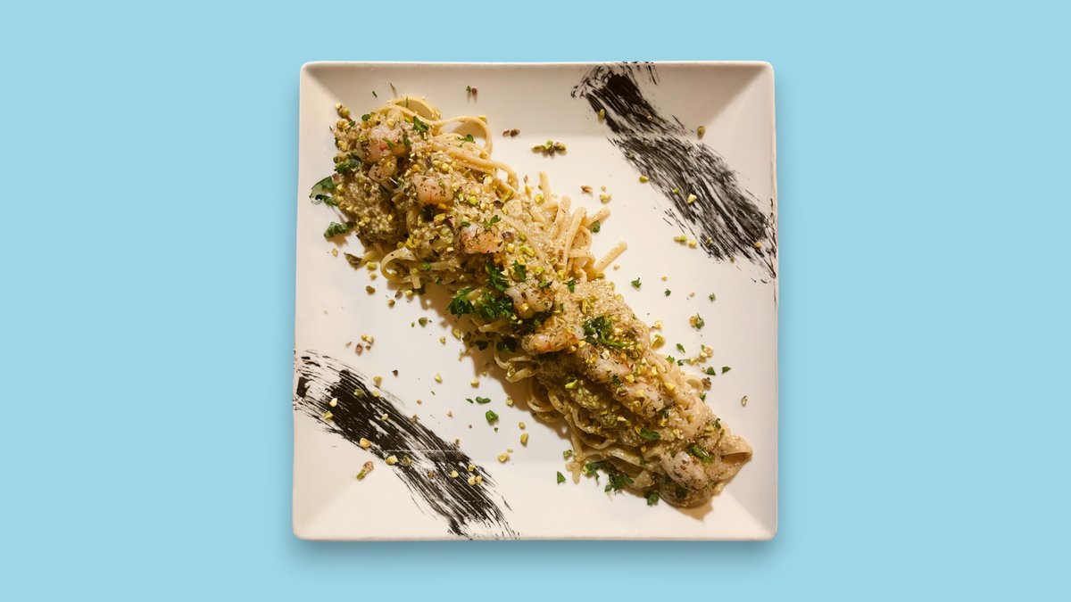 Linguine mit Pistazien-Mint Pesto, roten Garnelen Tatar und Orangennote