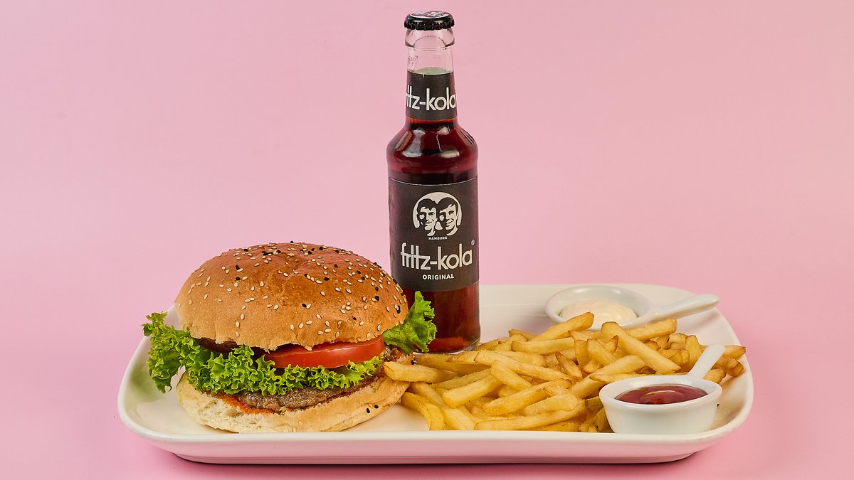 1x Balkan Burger XL 1x Pommes frites 1x Getränk nach Wahl ohne Zwiebeln, Kajmak (Schmand), Ajvar (Paprikapaste) und Brot