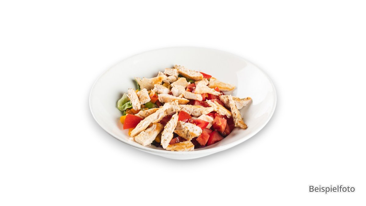 gebratene Hähnchenbruststreifen mit frischen Champignons auf gemischtem Salat der Saison