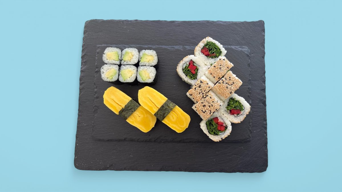 16 Stück 8 x Inside Out Rucola Paprika 6 x Maki Avocado 2 x Nigiri Tamago