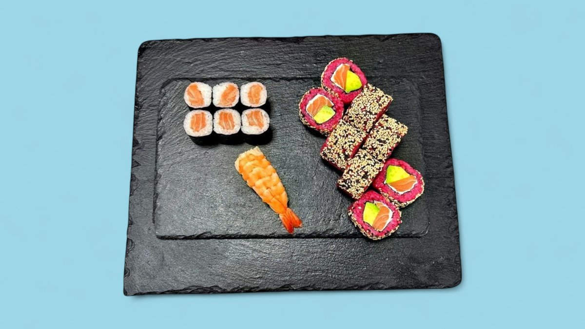 42 Stück 8x California Inside Out 8x Sake Avocado Inside Out 6x Avocado Maki 6x Tekka Maki 6x Sake Maki 2x Sake Nigiri 2x Maguro Nigiri 2x Ebi Nigiri 2x Tamago Nigiri
