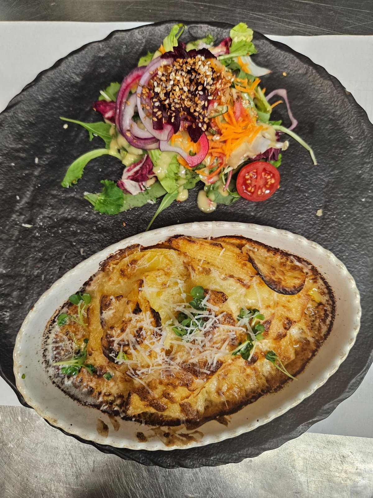 Gratin Dauphinois au Roquefort mit Salat