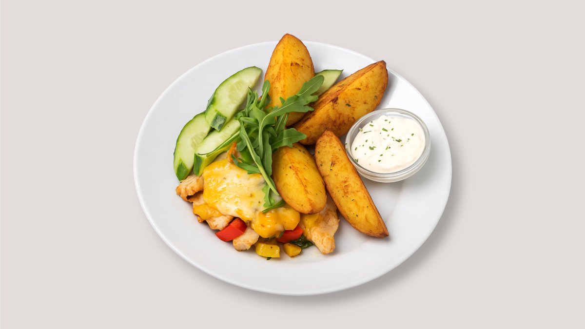 Kartoffelecken mit gebratener Hähnchenbrust, Gemüse und Käse überbacken, dazu Sauerrahm