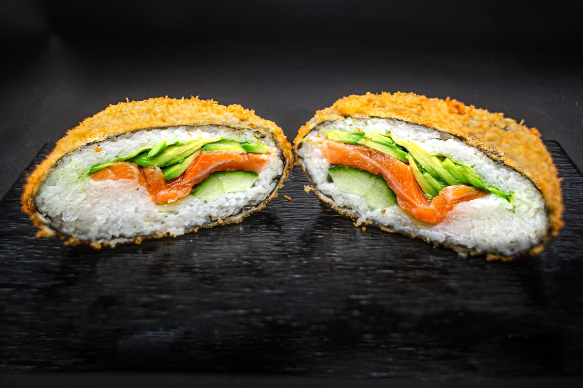 Sushi Burger mit Lachs, Gurke, Avocado und Frischkäse
