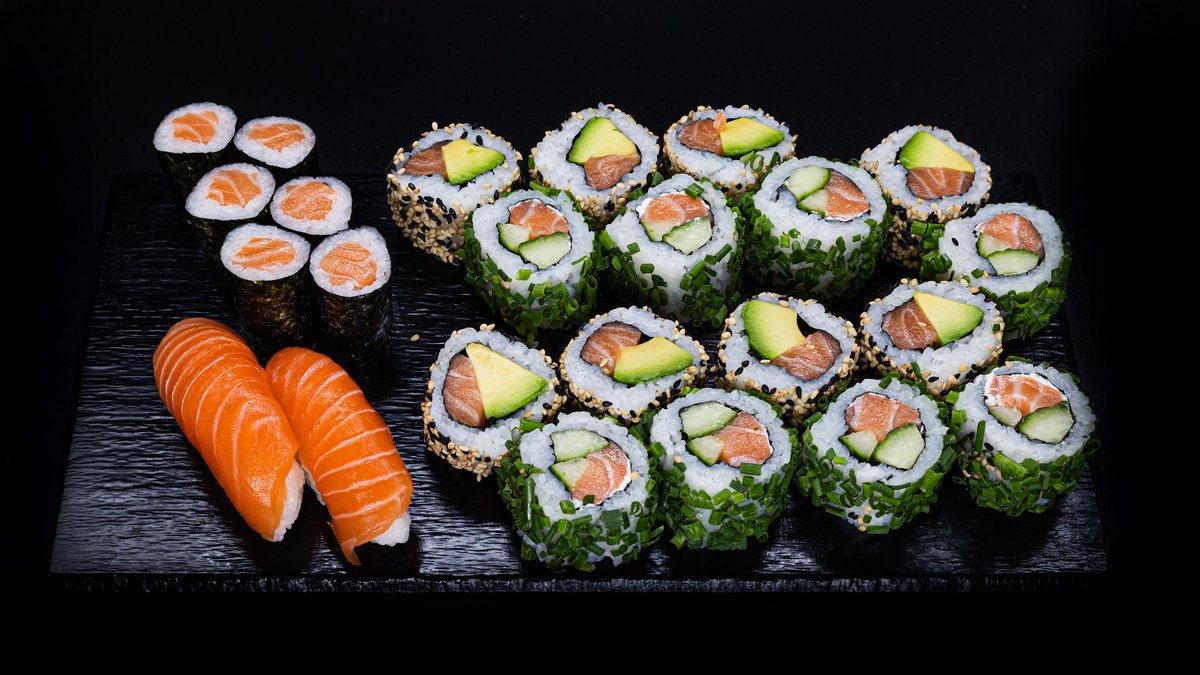 8x Inside-Out Sake Kappa-Schnittlauch 8x Inside-Out Sake Avocado-Sesam 6x Maki Sake 2x Nigiri Sake