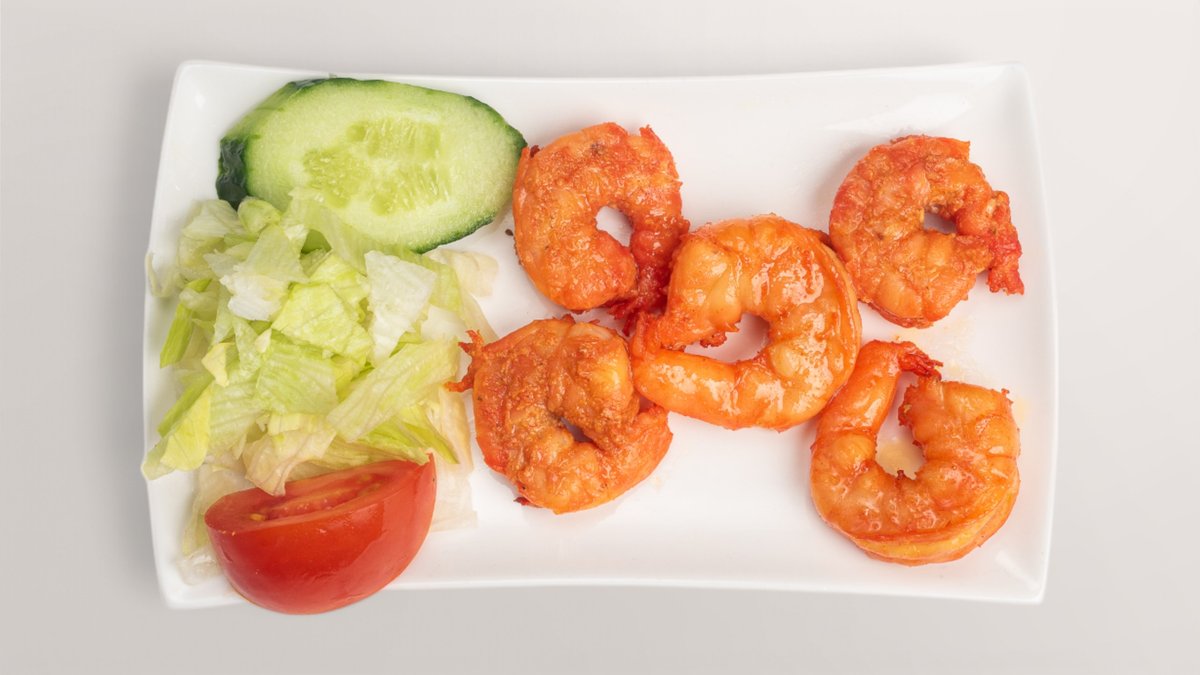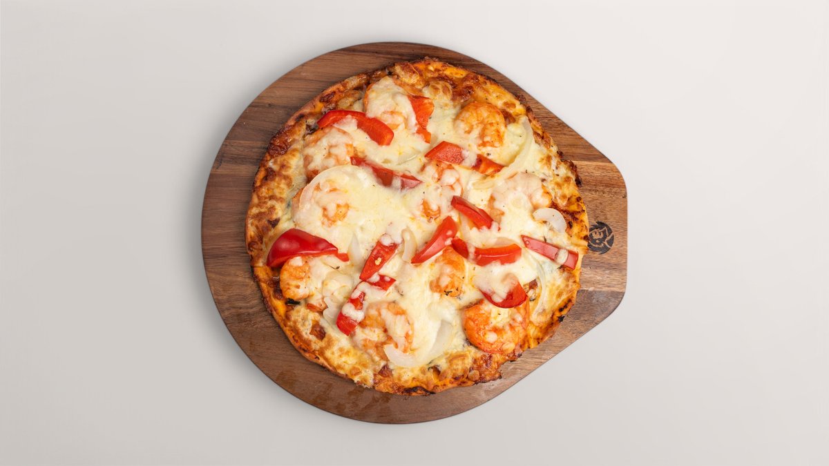 mit gegrillten Garnelen, Zwiebeln, Oliven und Paprika