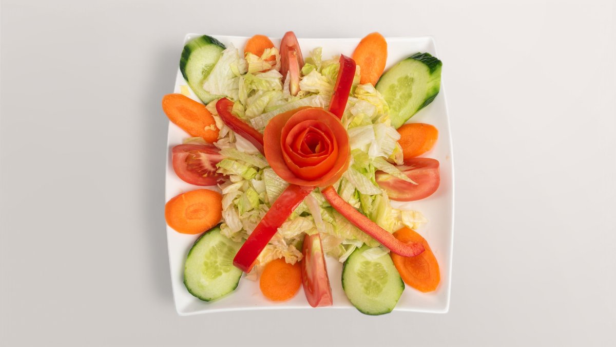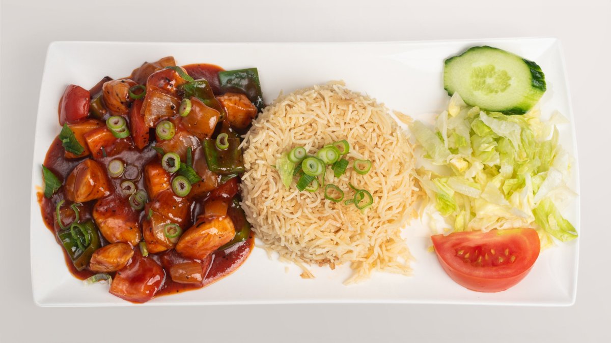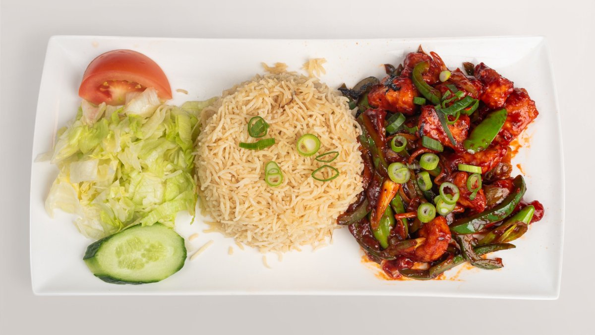 alle Gerichte werden mit Reis, Salat und in einer Größe deiner Wahl serviert