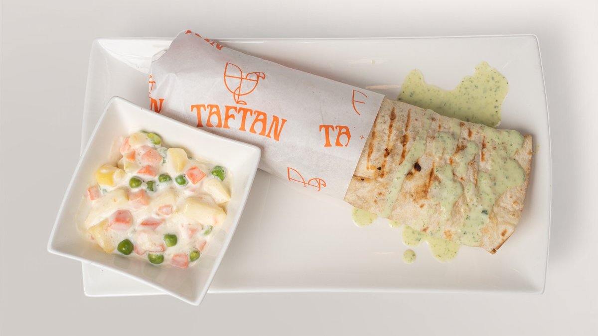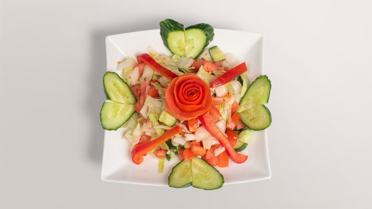 alle Gerichte werden mit Zwiebeln und Minzsoße zubereitet und mit russischem Salat serviert
